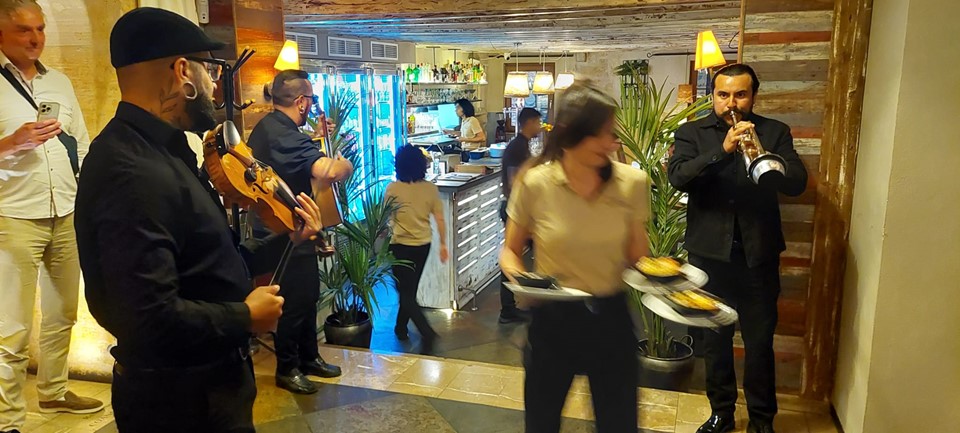 Bij restaurant Chez Camille kregen ze de uitdaging aan om de 70 uitgehongerde BC leden een smakelijk Spaans “Cenar” voor te schotelen. Erg dapper. Om de sfeer te verhogen werden er spontaan 3 straatmuzikanten gerekruteerd. Sommige BC leden werden daar zo lyrisch van dat ze probeerde extra liedjes te kopen. Blijkt toch dat met geld niet alles te koop is.